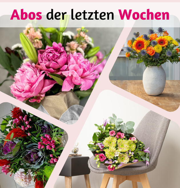 Unsere Blumen bieten ständig neue Überraschungen. Schau dir hier die Blumen der letzten Woche an, um großartige Sträuße zu entdecken. Inspiriere dich oder verschaffe dir einen Überblick, ohne die kommende Überraschung zu verraten. Verpasse keinen Strauß – abonniere jetzt!