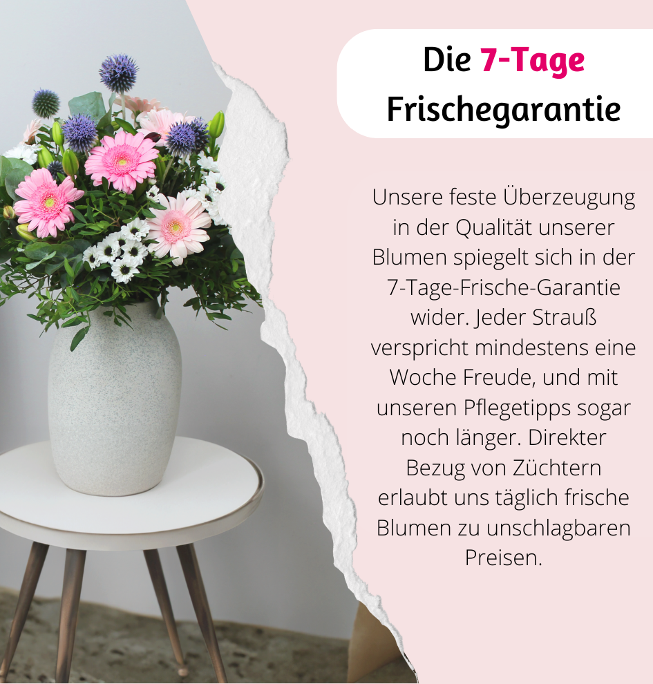 Unsere Blumen kommen ganz frisch direkt vom Gärtner und werden von professionellen und erfahrenen Floristen zu herrlichen Sträußen arrangiert. Mit unserer 7-Tage-Frischegarantie kannst du dir sicher sein, dass die Blumen auch bei dir noch in Top-Qualität ankommen. Sicher verpackt und mit einer Frischetüte versehen werden sie so direkt zu dir nach Hause geschickt.